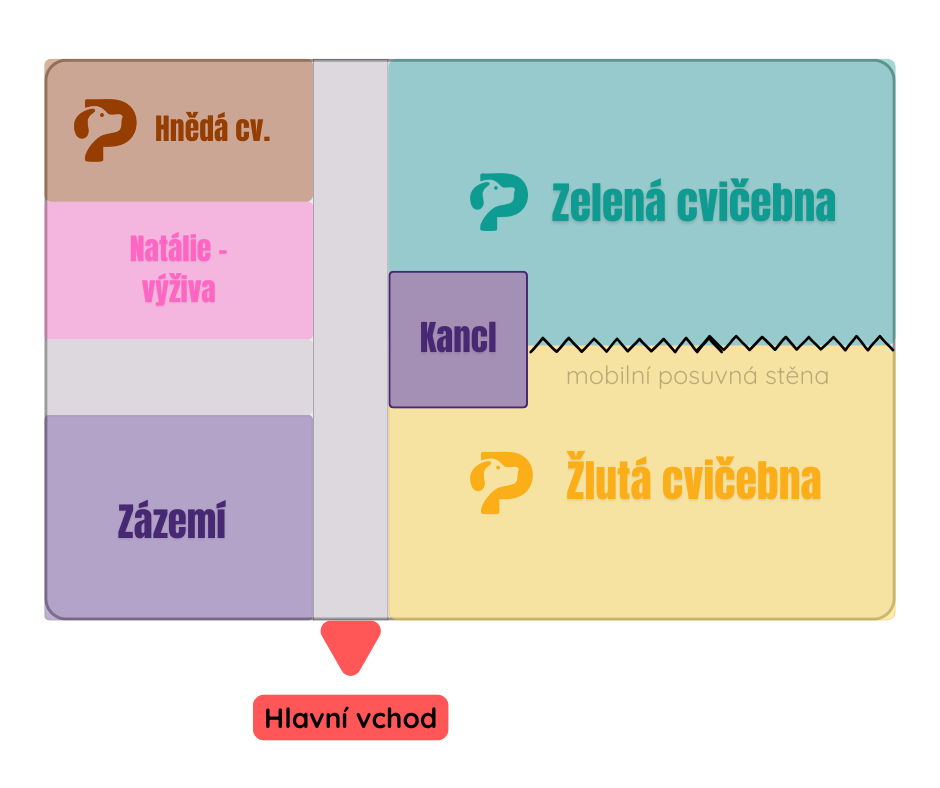 🔹 Dvě malé cvičebny (cca 80 m² ) – skvělá pro individuální tréninky, nácvik základní poslušnosti apod. Jedná se o rozdělení velké cvičebny mobilní stěnou